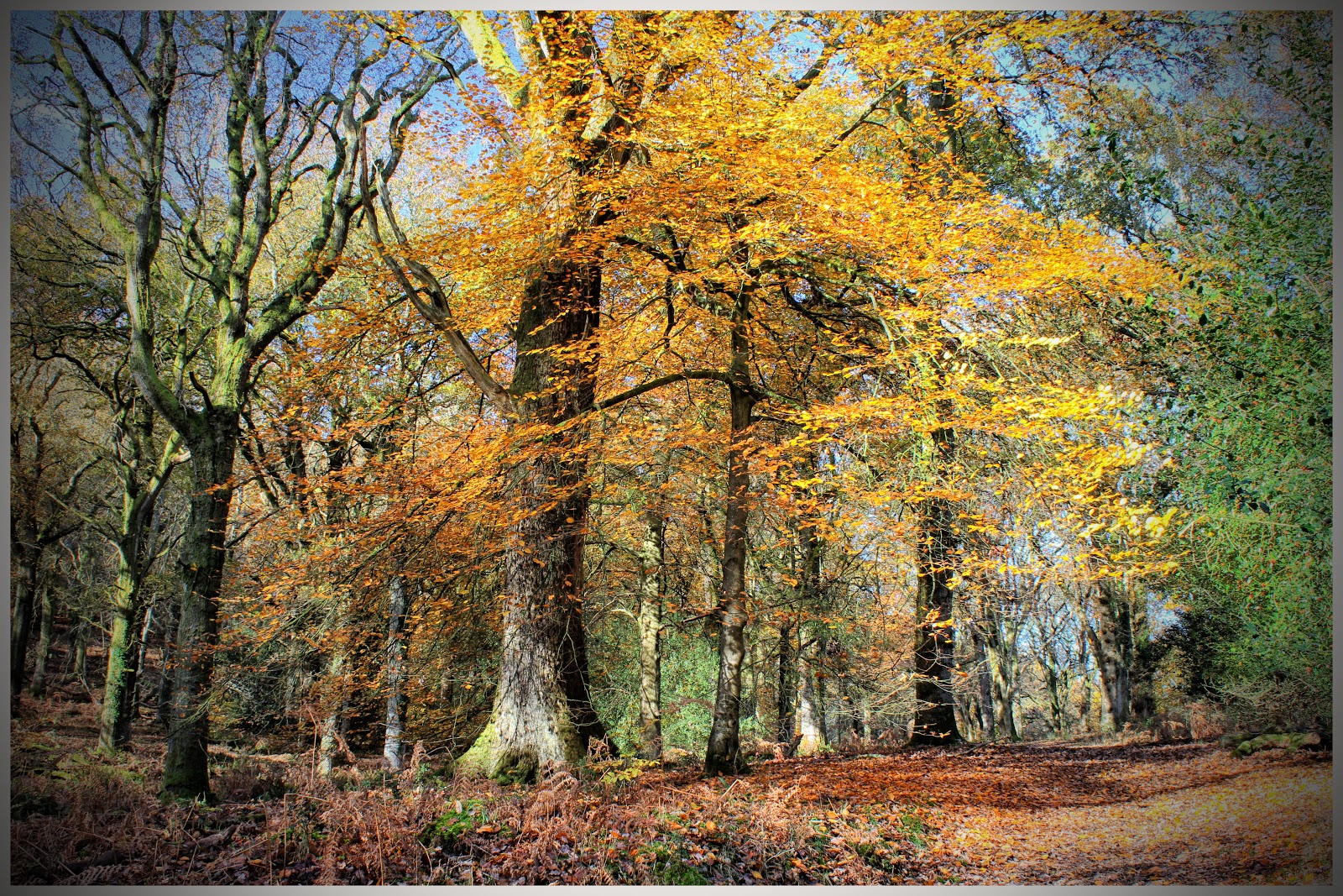 This oak seems to have outgrown the iron fence put around it many years ago, with a loaded fuel train in the background.